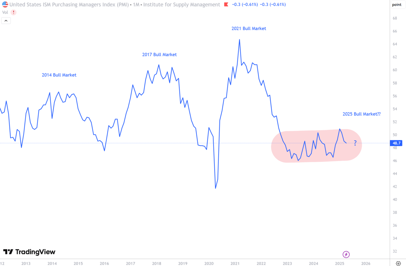 The ISM is a business cycle indicator often called the heartbeat of the economy: expansion, peak, contraction, and recovery. It influences everything from investor confidence to risk appetite. In crypto, it often defines whether weāre in a Bitcoin-led market or a broader altcoin bull run. When macro conditions ease and growth picks up, liquidity flows into riskier assets, including crypto. You can clearly see the historical association with each bull market run: